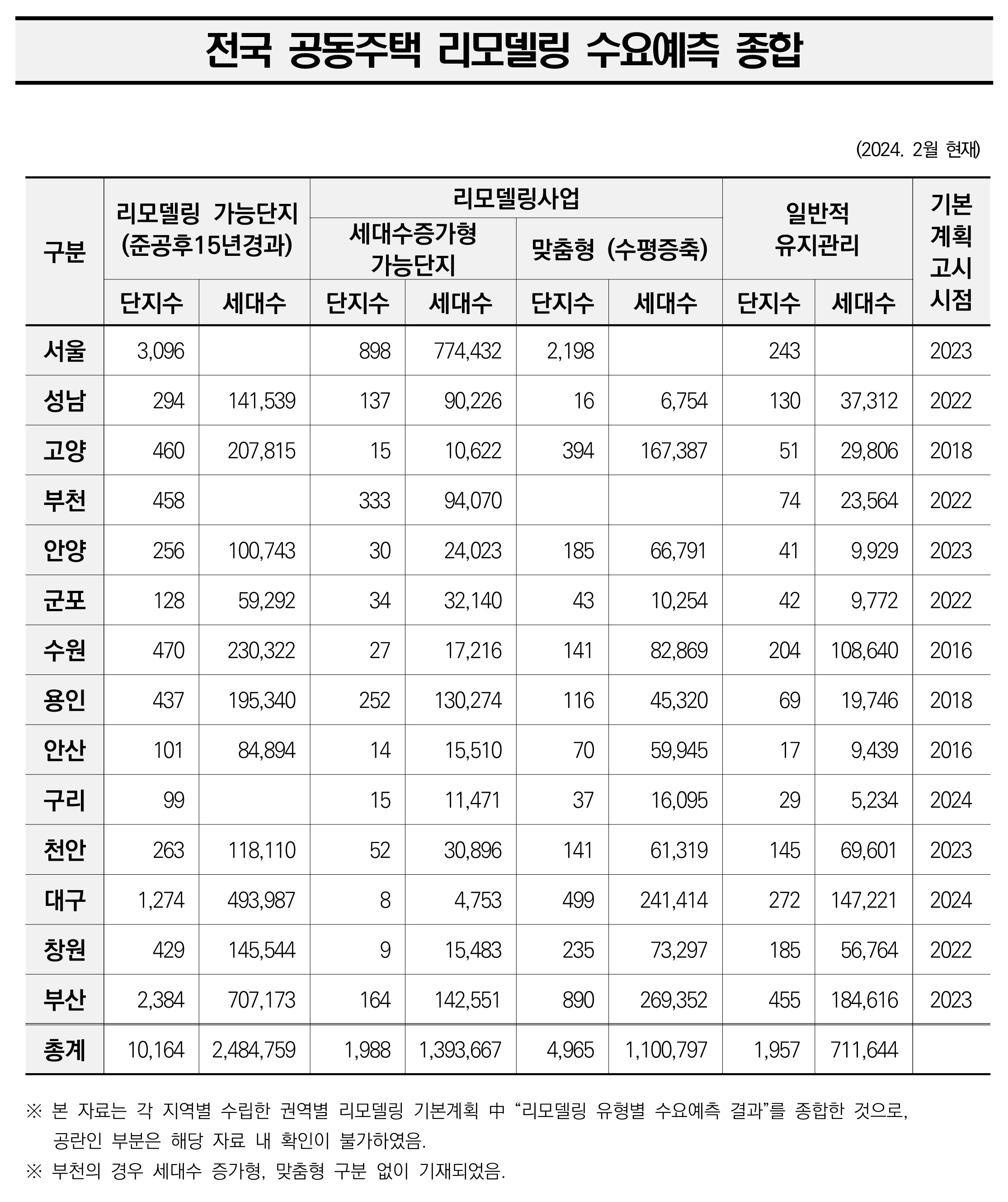 전국 약 14개가 넘는 지자체에서 리모델링 기본계획을 수립하였으며, 이 자료를 기준하여 추산하면 약 250만 세대가 리모델링 대상지로 명시되어 있고, 세대수 증가형 리모델링 사업만 국한하여 추정할 때도 약 139만 세대가 리모델링 대상 시장이다. 노후 건축물은 앞으로도 지속적으로 증가할 것이고 리모델링 시장은 필연적으로 커질 수 밖에 없고 다양한 이유로 비중이 높아질 것이다. 따라서 당연히 준비해야 한다. 지금부터 여러가지 시도를 통해 다양한 리모델링사업을 준비하고 이를 위한 경험과 기술력을 확보해야 하며, 관련된 제도적인 정비 또한 반드시 필요하다고 본다.