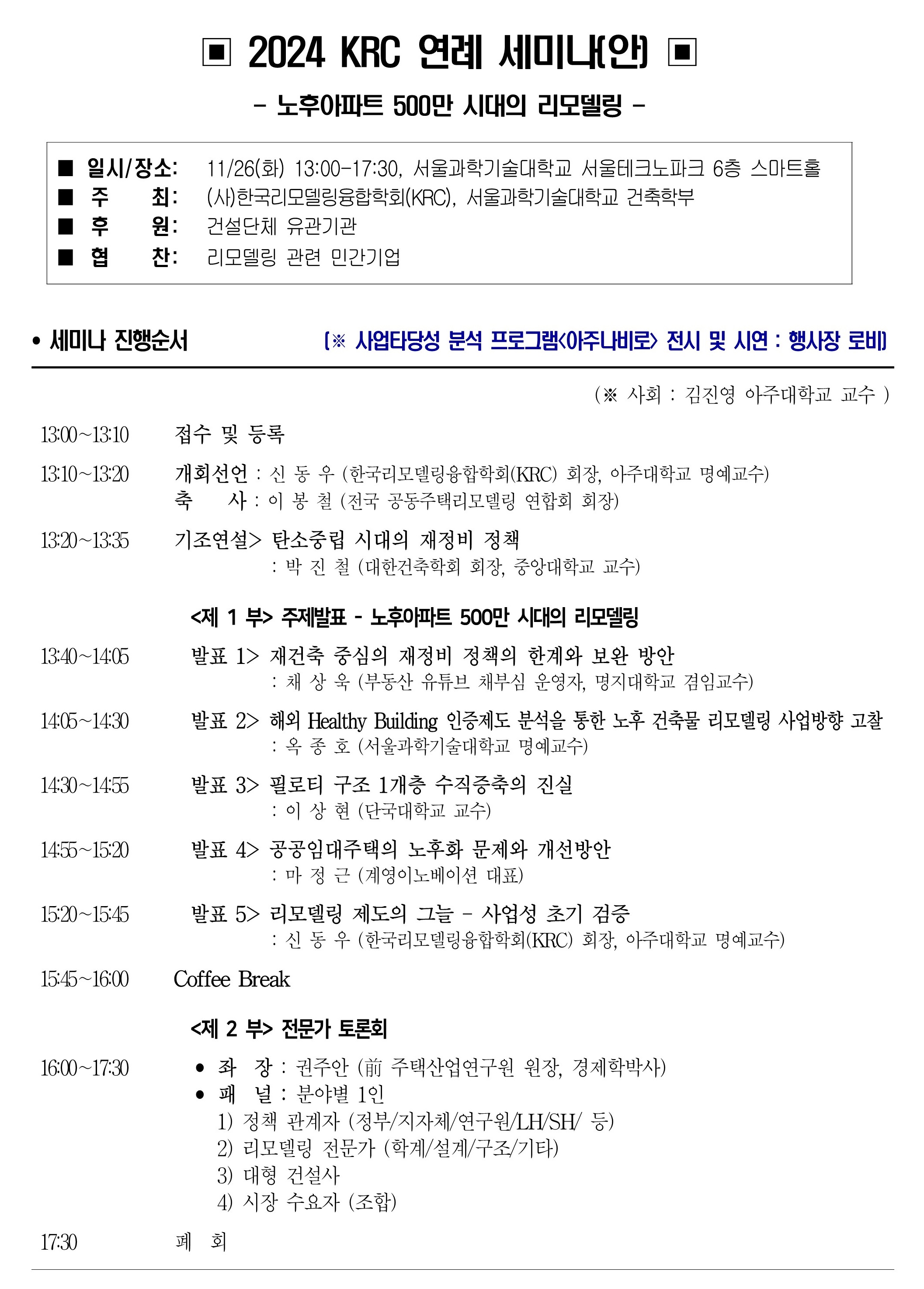 리모델링을 한 눈에! 한국리모델링융합학회(KRC) 11월 첫번째 뉴스레터(RNR)를 송부합니다. (20241104, KRC-RNR Vol.09) ★★ 파란색 부분을 클릭하시면 관련기사 열람이 가능합니다.★★ (수정안내) KRC 연례세미나 개최일은 2024. 11. 26(화) 입니다. |