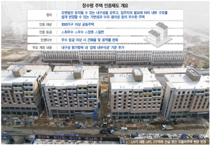 [정책제도 둘러보기] 국토교통부가 ‘장수명 주택 인증제도’를 개정해 모듈러, 프리캐스트 콘크리트(PC) 등 탈현장 건축(OSC) 공법의 주택에 대한 용적률, 건폐율 완화 인센티브를 추진한다. 국토부는 지난 6일 ‘주택건설기준 등에 관한 규칙 일부개정안’을 입법예고 하였으며, 제18조 제1항 제1호 장수명 주택 인증기준의 내구성 평가항목에 ‘강재의 내부식성능’을 추가하는 것이 주요 골자다. |