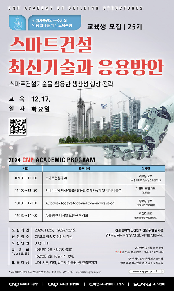 [교육안내] 21세기 디지털 시대에 우리 건설업계도 옛날 아날로그 방식에서 디지털화로 빠르게 변화하고 있습니다. CNP Group에서는 이러한 스마트 건설시대를 맞이하여 ‘스마트건설 최신기술과 응용방안’ 교육을 시행합니다. [교육내용]