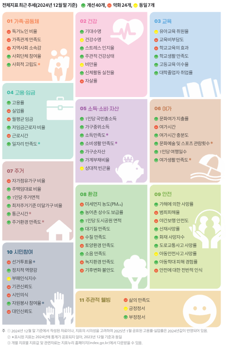 - 오늘의 에이드픽은 통계청에서 발간한 2024 국민 삶의 질 보고서입니다. - 우리나라는 낮은 출산율과 급속한 고령화, 높은 자살률 등으로 대표되는 낮은 삶의 만족도가 사회 문제로 대두되고 있습니다. 삶의 질 제고를 위한 정책적인 대응과 사회적 관심이 필요한 상황에서 통계청은 2011년부터 "국민 삶의 질 지표" 개발을 시작하였습니다. 그리고 2017년부터 "국민 삶의 질 보고서"를 매년 발간하고 있습니다. - "삶의 질"은 삶을 가치있게 만드는 모든 요소를 포괄하는 개념으로 객관적인 생활조건과 이에 대한 주관적인 인식으로 정의됩니다. 국민 삶의 질 지표체계는 11개 영역의 71개 지표로 구성되어 있습니다. 객관적 지표는 42개(59.2%), 주관적 지표는 29개(40.8%)입니다. 본 보고서는 2024년 12월 말까지 업데이트 된 지표를 기준으로 작성되었습니다. - 전체지표(71개)의 최근 추세를 살펴보면 개선(40개), 악화(24개), 동일(7개)로 나타납니다. 우리 삶을 구성하는 다양한 부분을 종합적으로 정리해 놓은 보고서입니다. "청년의 불안과 원인을 텍스트 마이닝을 통해 분석"하는 보고서와 "지난 20년간 국내 삶의 질 연구동향을 분석"하는 보고서도 같이 수록되어 있습니다. 각 지표에 대한 자세한 내용은 자료를 통해 확인할 수 있습니다. |